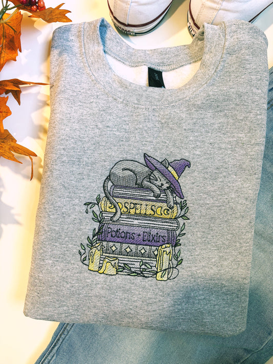 Witch Cat With Magical Books Embroidered Crewneck Sweatshirt