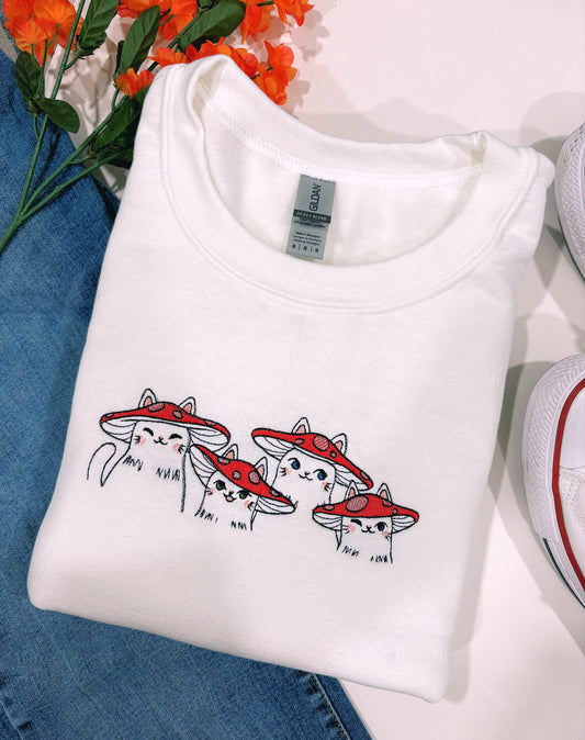 Kitties With Mushroom Hats - Embroidered Sweatshirt