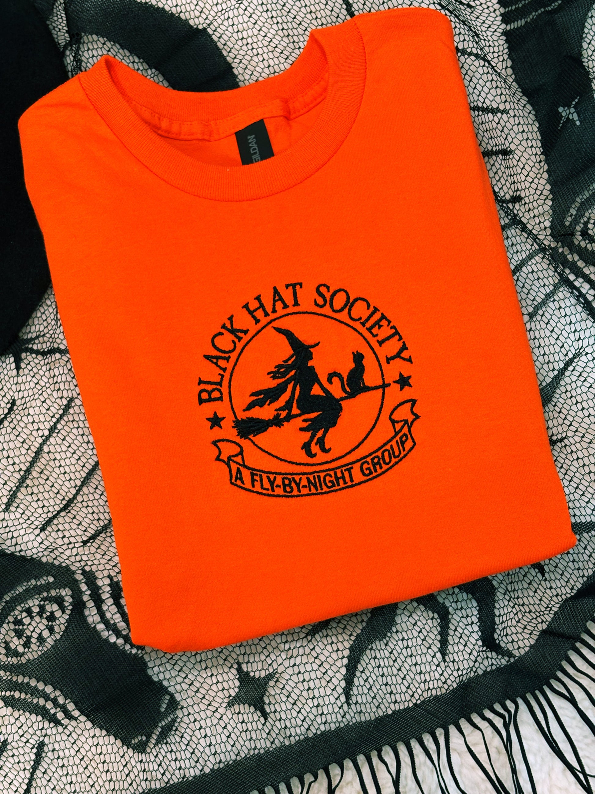 Embrace the eerie charm of the Black Hat Society with this embroidered witch T-shirt. Crafted with detailed stitching, it brings a mysterious vibe perfect for those who love to channel their inner sorceress. Whether you’re casting spells or just spooking around town, this shirt blends comfort with a dark, enchanting style.